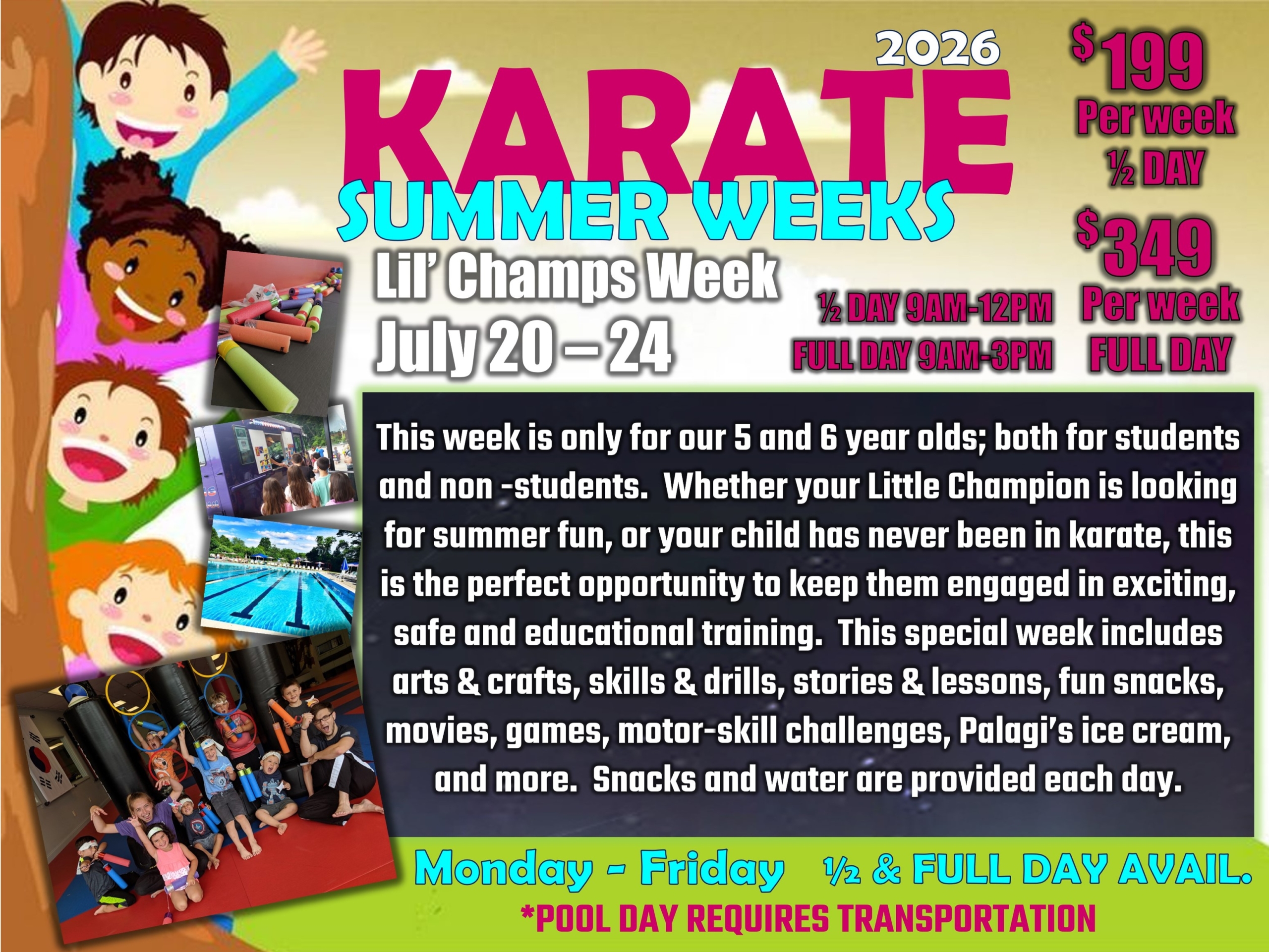 This week is only for our 5 and 6 year olds; both for students and non -students. Whether your Little Champion is looking for summer fun, or your child has never been in karate, this is the perfect opportunity to keep them engaged in exciting, safe and educational training. This special week includes arts & crafts, skills & drills, stories & lessons, fun snacks, movies, games, motor-skill challenges, Palagi’s ice cream, and more. Snacks and water are provided each day.